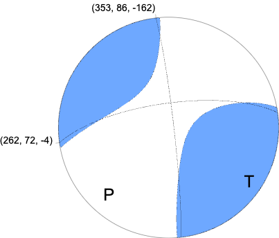 Regional Moment Tensor (Mwr) Moment 6.214e+14 N-m Magnitude 3.80 Mwr Depth 11.0 km Percent DC 66% Half Duration - Catalog US Data Source US Contributor US Nodal Planes Plane Strike Dip Rake NP1 262 72 -4 NP2 353 86 -162 Principal Axes Axis Value Plunge Azimuth T 6.705e+14 10 126 N -1.141e+14 72 5 P -5.564e+14 15 219 |