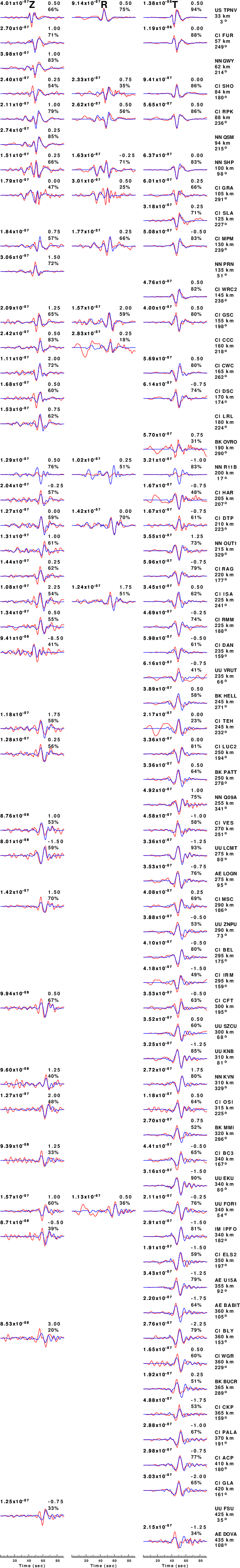 The comparison of the observed and predicted waveforms is given in the next figure. The red traces are the observed and the blue are the predicted. Each observed-predicted component is plotted to the same scale and peak amplitudes are indicated by the numbers to the left of each trace. A pair of numbers is given in black at the right of each predicted traces. The upper number it the time shift required for maximum correlation between the observed and predicted traces. This time shift is required because the synthetics are not computed at exactly the same distance as the observed, the velocity model used in the predictions may not be perfect and the epicentral parameters may be be off. A positive time shift indicates that the prediction is too fast and should be delayed to match the observed trace (shift to the right in this figure). A negative value indicates that the prediction is too slow. The lower number gives the percentage of variance reduction to characterize the individual goodness of fit (100% indicates a perfect fit).