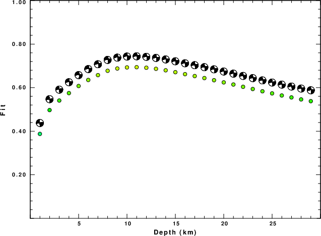 The program wvfgrd96 was used with good traces observed at short distance to determine the focal mechanism, depth and seismic moment. This technique requires a high quality signal and well determined velocity model for the Green's functions. To the extent that these are the quality data, this type of mechanism should be preferred over the radiation pattern technique which requires the separate step of defining the pressure and tension quadrants and the correct strike.