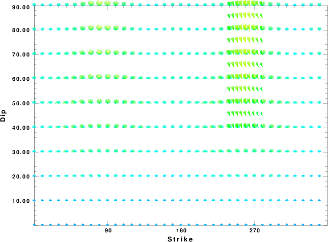| Focal mechanism sensitivity at the preferred depth. The red color indicates a very good fit to the waveforms. Each solution is plotted as a vector at a given value of strike and dip with the angle of the vector representing the rake angle, measured, with respect to the upward vertical (N) in the figure. |