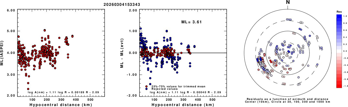 Left: ML computed using the IASPEI formula for Vertical components (research). Center: ML residuals computed using a modified IASPEI formula that accounts for path specific attenuation; the values used for the trimmed mean are indicated. The ML relation used for each figure is given at the bottom of each plot.