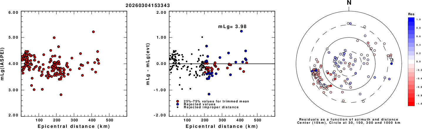 Left: mLg computed using the IASPEI formula. Center: mLg residuals versus epicentral distance ; the values used for the trimmed mean magnitude estimate are indicated.