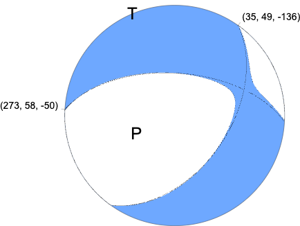 Regional Moment Tensor (Mwr) Moment 3.892e+14 N-m Magnitude 3.66 Mwr Depth 3.0 km Percent DC 94% Half Duration - Catalog US Data Source US Contributor US Nodal Planes Plane Strike Dip Rake NP1 35 49 -136 NP2 273 58 -50 Principal Axes Axis Value Plunge Azimuth T 3.834e+14 5 336 N 0.114e+14 33 70 P -3.948e+14 56 238 |