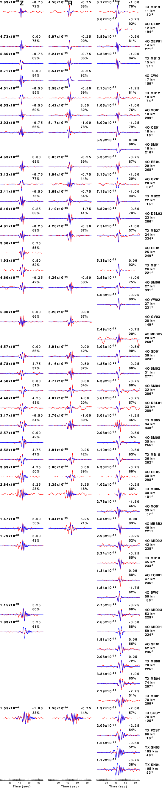 The comparison of the observed and predicted waveforms is given in the next figure. The red traces are the observed and the blue are the predicted. Each observed-predicted component is plotted to the same scale and peak amplitudes are indicated by the numbers to the left of each trace. A pair of numbers is given in black at the right of each predicted traces. The upper number it the time shift required for maximum correlation between the observed and predicted traces. This time shift is required because the synthetics are not computed at exactly the same distance as the observed, the velocity model used in the predictions may not be perfect and the epicentral parameters may be be off. A positive time shift indicates that the prediction is too fast and should be delayed to match the observed trace (shift to the right in this figure). A negative value indicates that the prediction is too slow. The lower number gives the percentage of variance reduction to characterize the individual goodness of fit (100% indicates a perfect fit).