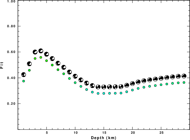 The program wvfgrd96 was used with good traces observed at short distance to determine the focal mechanism, depth and seismic moment. This technique requires a high quality signal and well determined velocity model for the Green's functions. To the extent that these are the quality data, this type of mechanism should be preferred over the radiation pattern technique which requires the separate step of defining the pressure and tension quadrants and the correct strike.