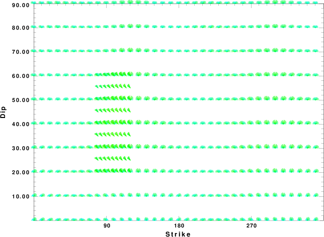 | Focal mechanism sensitivity at the preferred depth. The red color indicates a very good fit to the waveforms. Each solution is plotted as a vector at a given value of strike and dip with the angle of the vector representing the rake angle, measured, with respect to the upward vertical (N) in the figure. |