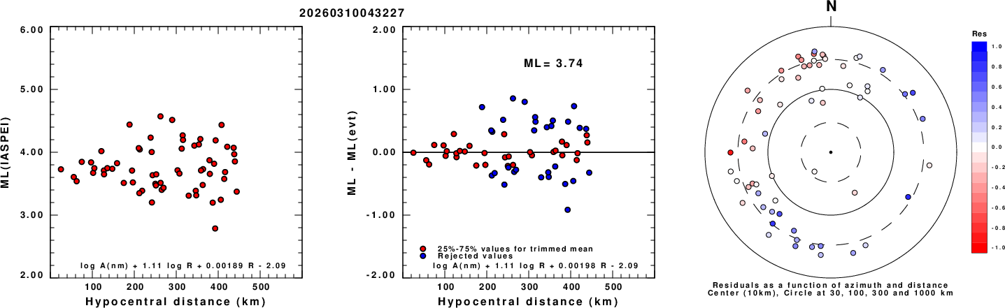 Left: ML computed using the IASPEI formula for Vertical components (research). Center: ML residuals computed using a modified IASPEI formula that accounts for path specific attenuation; the values used for the trimmed mean are indicated. The ML relation used for each figure is given at the bottom of each plot.