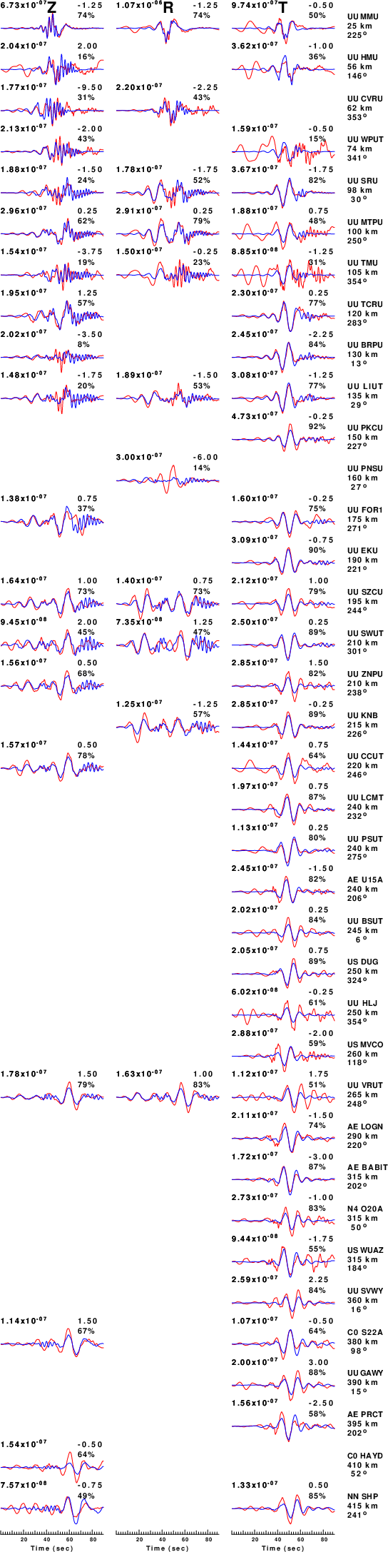 The comparison of the observed and predicted waveforms is given in the next figure. The red traces are the observed and the blue are the predicted. Each observed-predicted component is plotted to the same scale and peak amplitudes are indicated by the numbers to the left of each trace. A pair of numbers is given in black at the right of each predicted traces. The upper number it the time shift required for maximum correlation between the observed and predicted traces. This time shift is required because the synthetics are not computed at exactly the same distance as the observed, the velocity model used in the predictions may not be perfect and the epicentral parameters may be be off. A positive time shift indicates that the prediction is too fast and should be delayed to match the observed trace (shift to the right in this figure). A negative value indicates that the prediction is too slow. The lower number gives the percentage of variance reduction to characterize the individual goodness of fit (100% indicates a perfect fit).