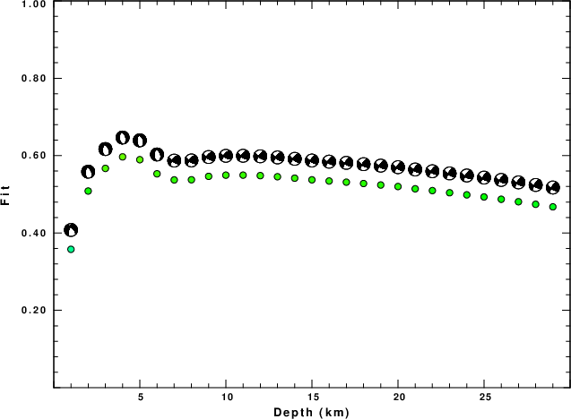 The program wvfgrd96 was used with good traces observed at short distance to determine the focal mechanism, depth and seismic moment. This technique requires a high quality signal and well determined velocity model for the Green's functions. To the extent that these are the quality data, this type of mechanism should be preferred over the radiation pattern technique which requires the separate step of defining the pressure and tension quadrants and the correct strike.