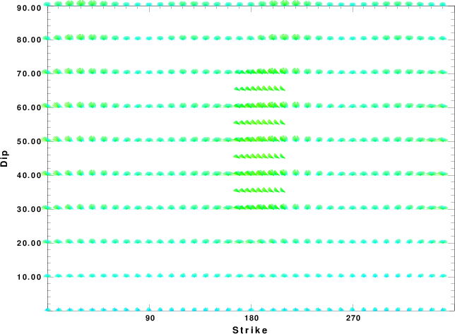 | Focal mechanism sensitivity at the preferred depth. The red color indicates a very good fit to the waveforms. Each solution is plotted as a vector at a given value of strike and dip with the angle of the vector representing the rake angle, measured, with respect to the upward vertical (N) in the figure. |