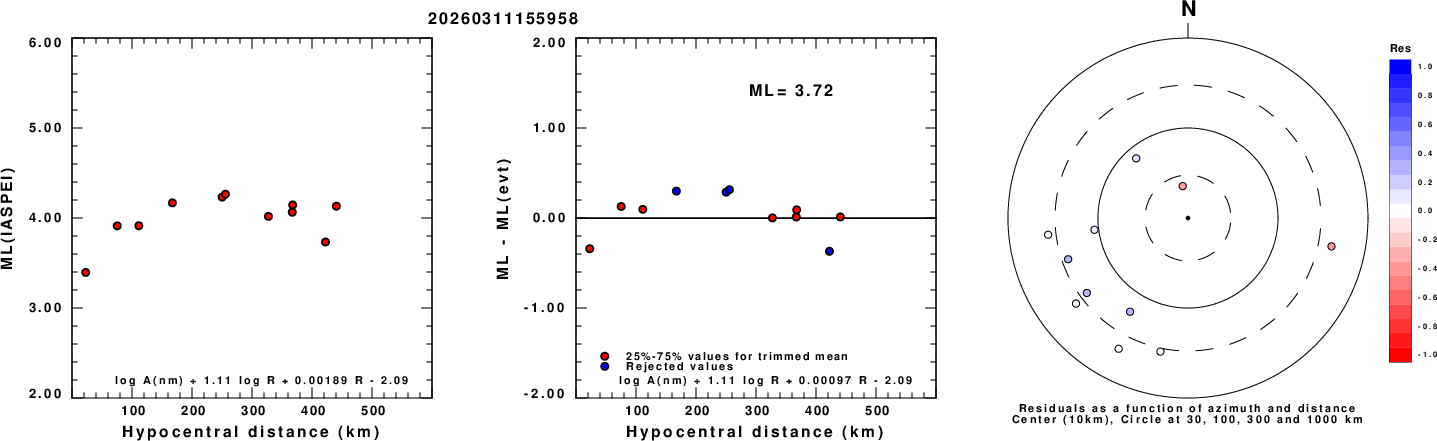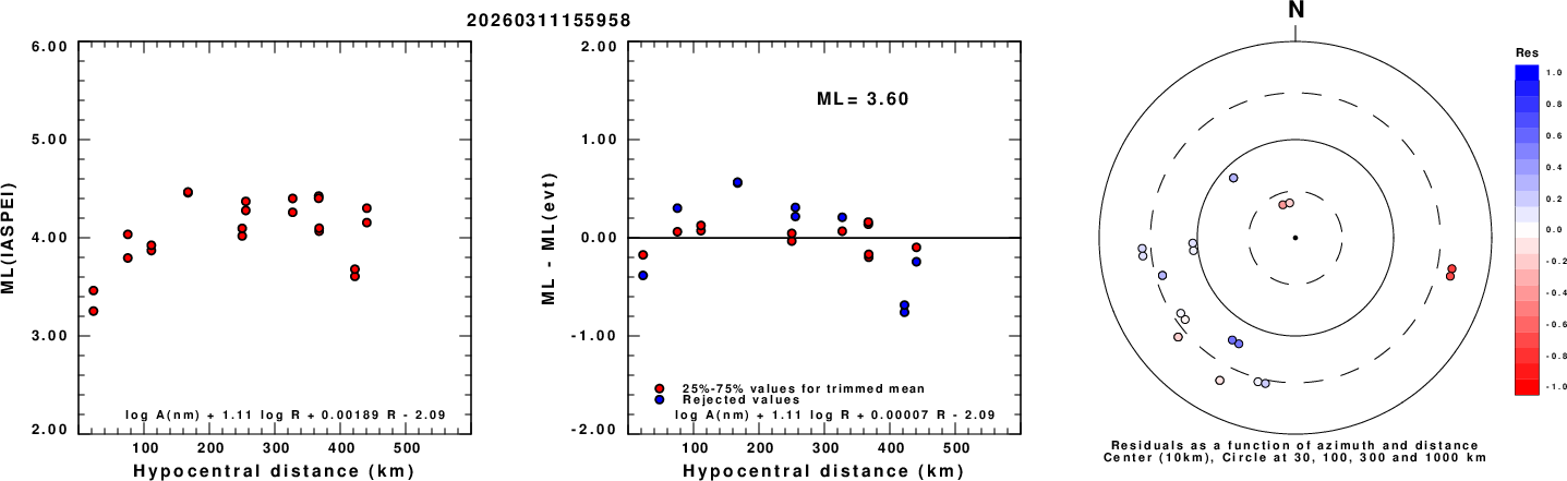 Left: ML computed using the IASPEI formula for Vertical components (research). Center: ML residuals computed using a modified IASPEI formula that accounts for path specific attenuation; the values used for the trimmed mean are indicated. The ML relation used for each figure is given at the bottom of each plot.