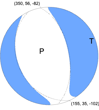 Regional Moment Tensor (Mwr) Moment 1.133e+15 N-m Magnitude 3.97 Mwr Depth 8.0 km Percent DC 87% Half Duration - Catalog US Data Source US Contributor US Nodal Planes Plane Strike Dip Rake NP1 350 56 -82 NP2 155 35 -102 Principal Axes Axis Value Plunge Azimuth T 1.169e+15 11 74 N -0.074e+15 7 165 P -1.095e+15 77 287 |