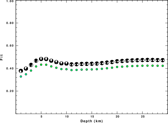 The program wvfgrd96 was used with good traces observed at short distance to determine the focal mechanism, depth and seismic moment. This technique requires a high quality signal and well determined velocity model for the Green's functions. To the extent that these are the quality data, this type of mechanism should be preferred over the radiation pattern technique which requires the separate step of defining the pressure and tension quadrants and the correct strike.