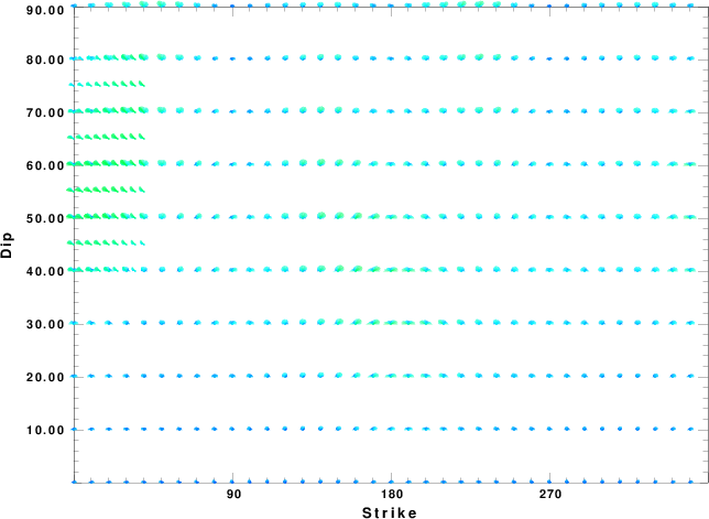 | Focal mechanism sensitivity at the preferred depth. The red color indicates a very good fit to the waveforms. Each solution is plotted as a vector at a given value of strike and dip with the angle of the vector representing the rake angle, measured, with respect to the upward vertical (N) in the figure. |