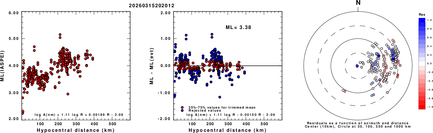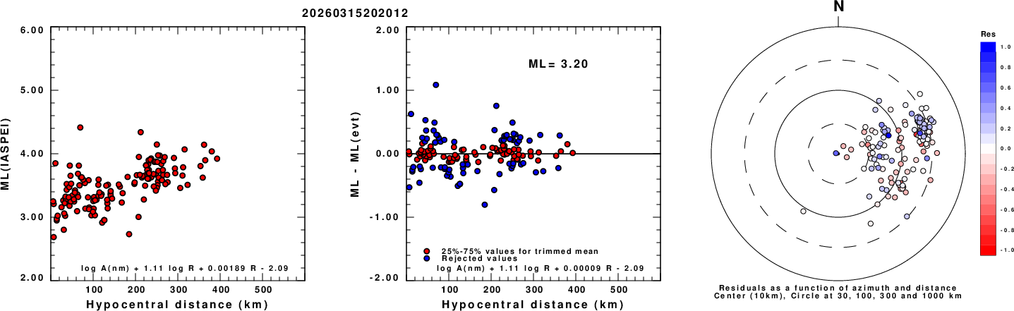 Left: ML computed using the IASPEI formula for Vertical components (research). Center: ML residuals computed using a modified IASPEI formula that accounts for path specific attenuation; the values used for the trimmed mean are indicated. The ML relation used for each figure is given at the bottom of each plot.