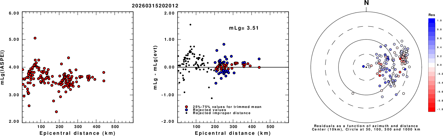 Left: mLg computed using the IASPEI formula. Center: mLg residuals versus epicentral distance ; the values used for the trimmed mean magnitude estimate are indicated.