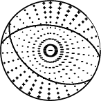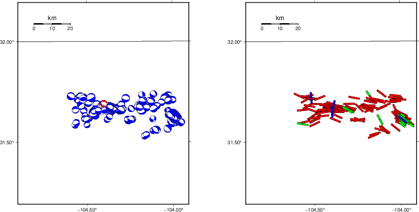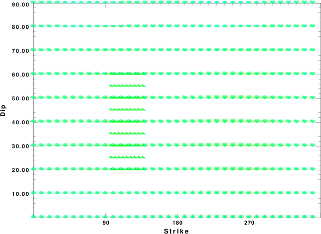 | Focal mechanism sensitivity at the preferred depth. The red color indicates a very good fit to the waveforms. Each solution is plotted as a vector at a given value of strike and dip with the angle of the vector representing the rake angle, measured, with respect to the upward vertical (N) in the figure. |