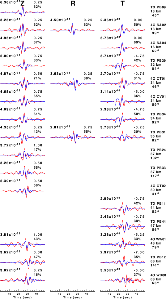 The comparison of the observed and predicted waveforms is given in the next figure. The red traces are the observed and the blue are the predicted. Each observed-predicted component is plotted to the same scale and peak amplitudes are indicated by the numbers to the left of each trace. A pair of numbers is given in black at the right of each predicted traces. The upper number it the time shift required for maximum correlation between the observed and predicted traces. This time shift is required because the synthetics are not computed at exactly the same distance as the observed, the velocity model used in the predictions may not be perfect and the epicentral parameters may be be off. A positive time shift indicates that the prediction is too fast and should be delayed to match the observed trace (shift to the right in this figure). A negative value indicates that the prediction is too slow. The lower number gives the percentage of variance reduction to characterize the individual goodness of fit (100% indicates a perfect fit).