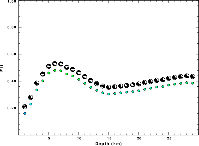 The program wvfgrd96 was used with good traces observed at short distance to determine the focal mechanism, depth and seismic moment. This technique requires a high quality signal and well determined velocity model for the Green's functions. To the extent that these are the quality data, this type of mechanism should be preferred over the radiation pattern technique which requires the separate step of defining the pressure and tension quadrants and the correct strike.