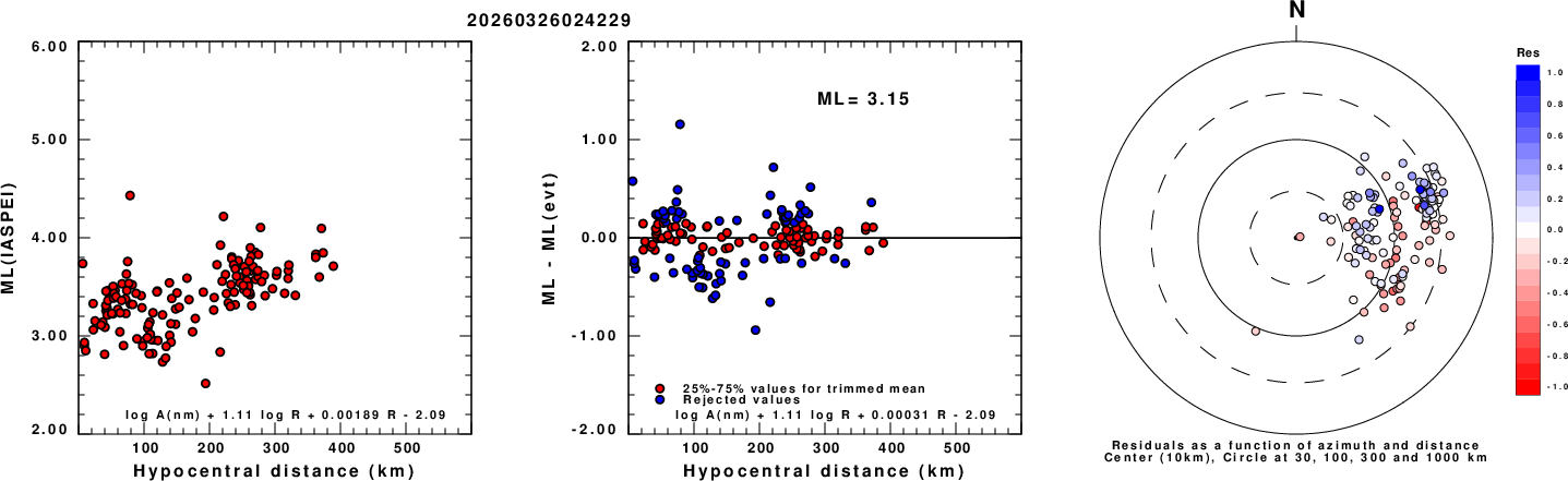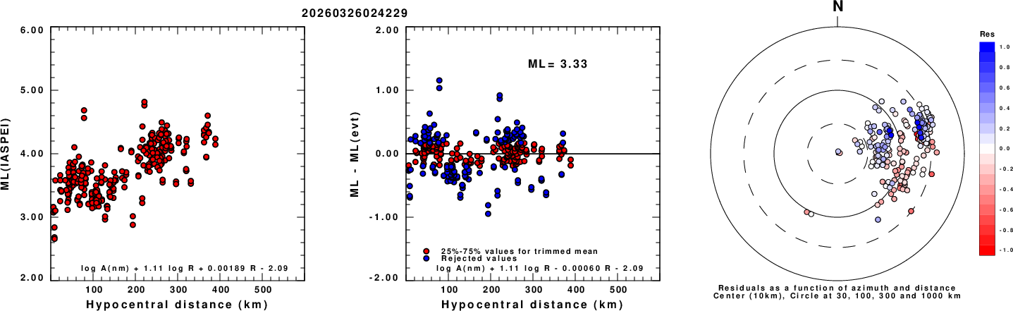 Left: ML computed using the IASPEI formula for Vertical components (research). Center: ML residuals computed using a modified IASPEI formula that accounts for path specific attenuation; the values used for the trimmed mean are indicated. The ML relation used for each figure is given at the bottom of each plot.