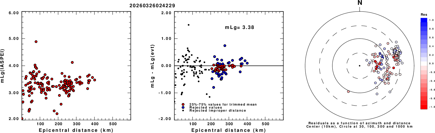 Left: mLg computed using the IASPEI formula. Center: mLg residuals versus epicentral distance ; the values used for the trimmed mean magnitude estimate are indicated.