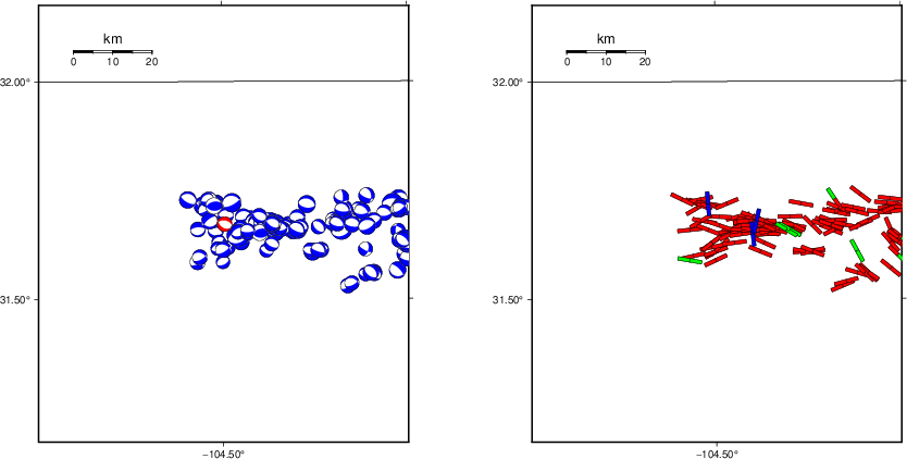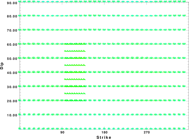 | Focal mechanism sensitivity at the preferred depth. The red color indicates a very good fit to the waveforms. Each solution is plotted as a vector at a given value of strike and dip with the angle of the vector representing the rake angle, measured, with respect to the upward vertical (N) in the figure. |