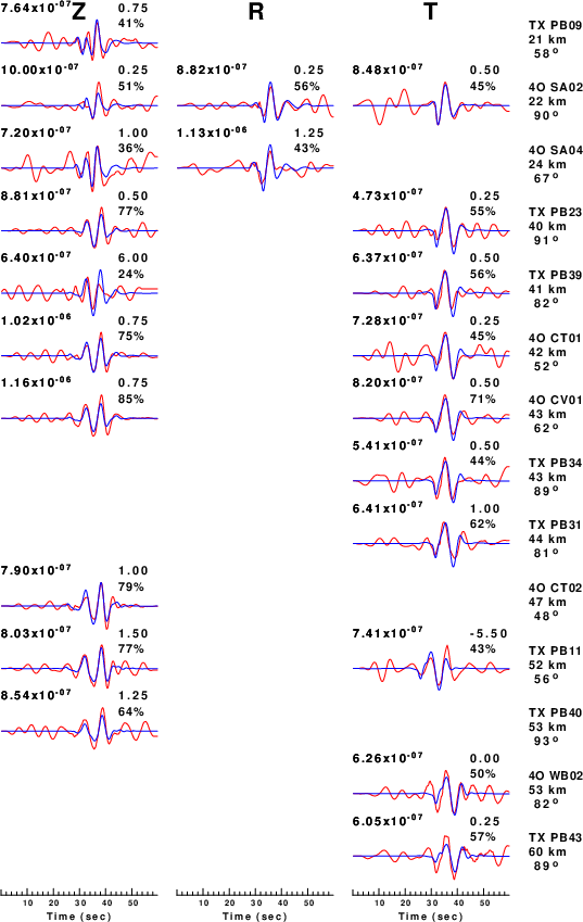 The comparison of the observed and predicted waveforms is given in the next figure. The red traces are the observed and the blue are the predicted. Each observed-predicted component is plotted to the same scale and peak amplitudes are indicated by the numbers to the left of each trace. A pair of numbers is given in black at the right of each predicted traces. The upper number it the time shift required for maximum correlation between the observed and predicted traces. This time shift is required because the synthetics are not computed at exactly the same distance as the observed, the velocity model used in the predictions may not be perfect and the epicentral parameters may be be off. A positive time shift indicates that the prediction is too fast and should be delayed to match the observed trace (shift to the right in this figure). A negative value indicates that the prediction is too slow. The lower number gives the percentage of variance reduction to characterize the individual goodness of fit (100% indicates a perfect fit).