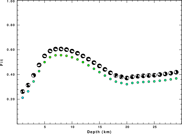 The program wvfgrd96 was used with good traces observed at short distance to determine the focal mechanism, depth and seismic moment. This technique requires a high quality signal and well determined velocity model for the Green's functions. To the extent that these are the quality data, this type of mechanism should be preferred over the radiation pattern technique which requires the separate step of defining the pressure and tension quadrants and the correct strike.