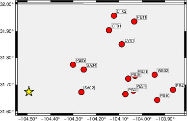 The focal mechanism was determined using broadband seismic waveforms. The location of the event (star) and the stations used for (red) the waveform inversion are shown in the next figure.