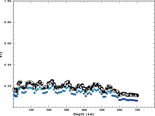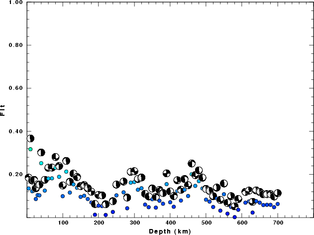 | Goodness of fit as a function of source depth. The measure is 1 - SUM (o -p)2 / SUM o2. A value of 1.0 is the best fit. The best double couple mechanism for the solution depth is plotted above goodness of fit value to indicate how the mefhanism may change with depth. |