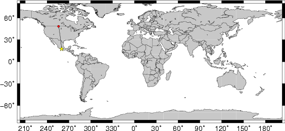 Location of the earthquake (yellow star) and great circle path from the epicenter to each station (red) [created using GMT (Wessel, P., and W. H. F. Smith, New version of Generic Mapping Tools released, EOS Trans. AGU, 76 329, 1995.)] |