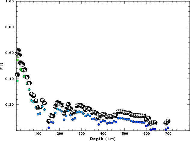 | Goodness of fit as a function of source depth. The measure is 1 - SUM (o -p)2 / SUM o2. A value of 1.0 is the best fit. The best double couple mechanism for the solution depth is plotted above goodness of fit value to indicate how the mefhanism may change with depth. |