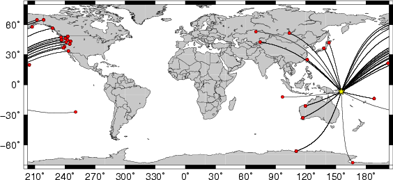 Location of the earthquake (yellow star) and great circle path from the epicenter to each station (red) [created using GMT (Wessel, P., and W. H. F. Smith, New version of Generic Mapping Tools released, EOS Trans. AGU, 76 329, 1995.)] |