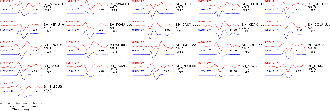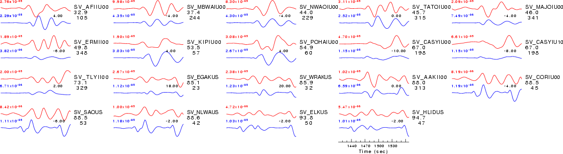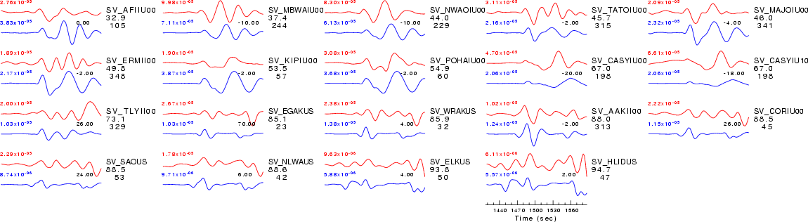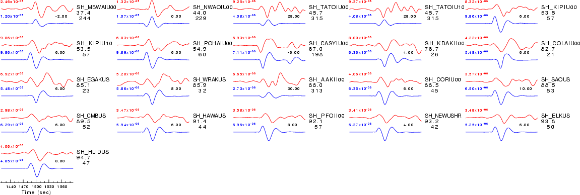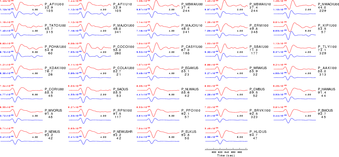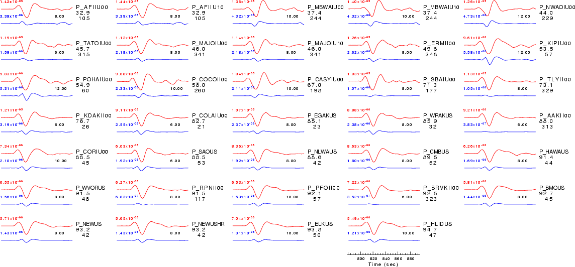 | Comparison of the observed traces (red) and solution predicted traces (blue) ordered in terms of increasing epicentral distance. Each pair of traces is annotated with the station name, epicentral distance in degrees, source to station azimuth in degrees. Each pair of traces is plotted with the same scale and the peak amplitudes are indicated at the lect of each trace. Finally the time shift between the P-wave first arrival picked and the the theoretical P-wave first arrival in the predicted trace is indicated, with a positive sign indicating that the predicted trace has been shifted to the right by the given number of seconds. as a function of source to station azimuth in degrees (D). The purpose of this display is to highlight the azimuthal dependence on the first motion. The traces are annotated with the station name at the top. |