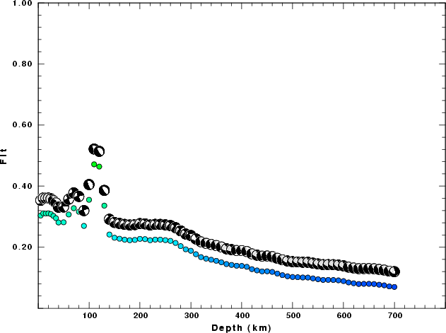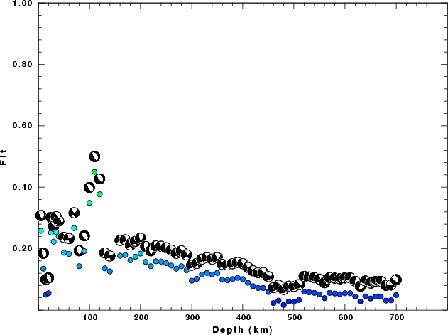 | Goodness of fit as a function of source depth. The measure is 1 - SUM (o -p)2 / SUM o2. A value of 1.0 is the best fit. The best double couple mechanism for the solution depth is plotted above goodness of fit value to indicate how the mefhanism may change with depth. |