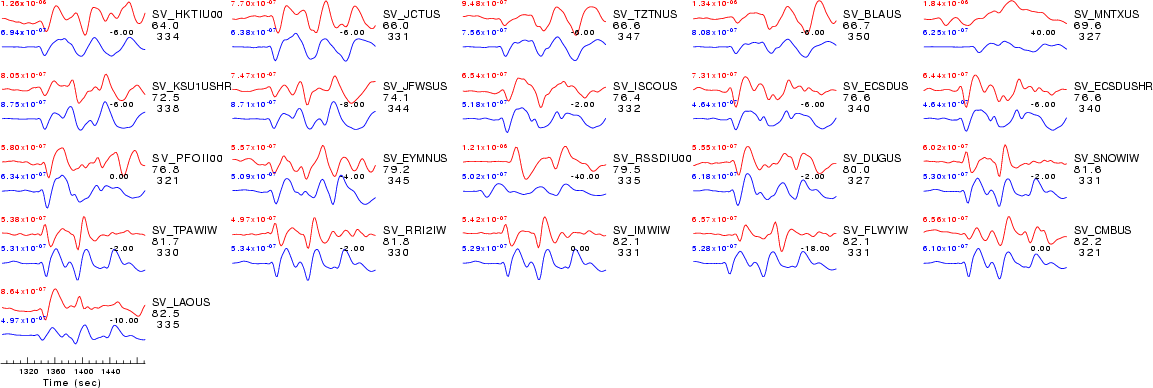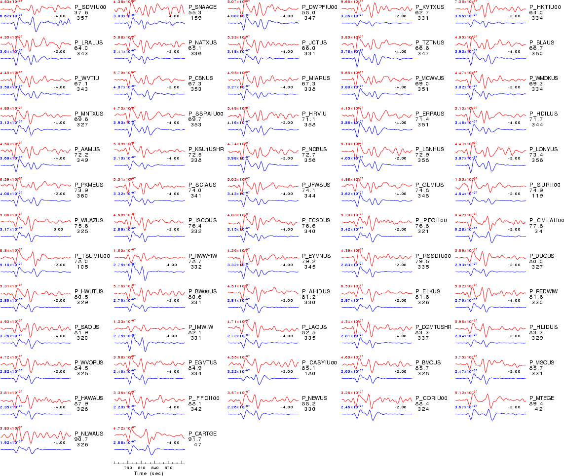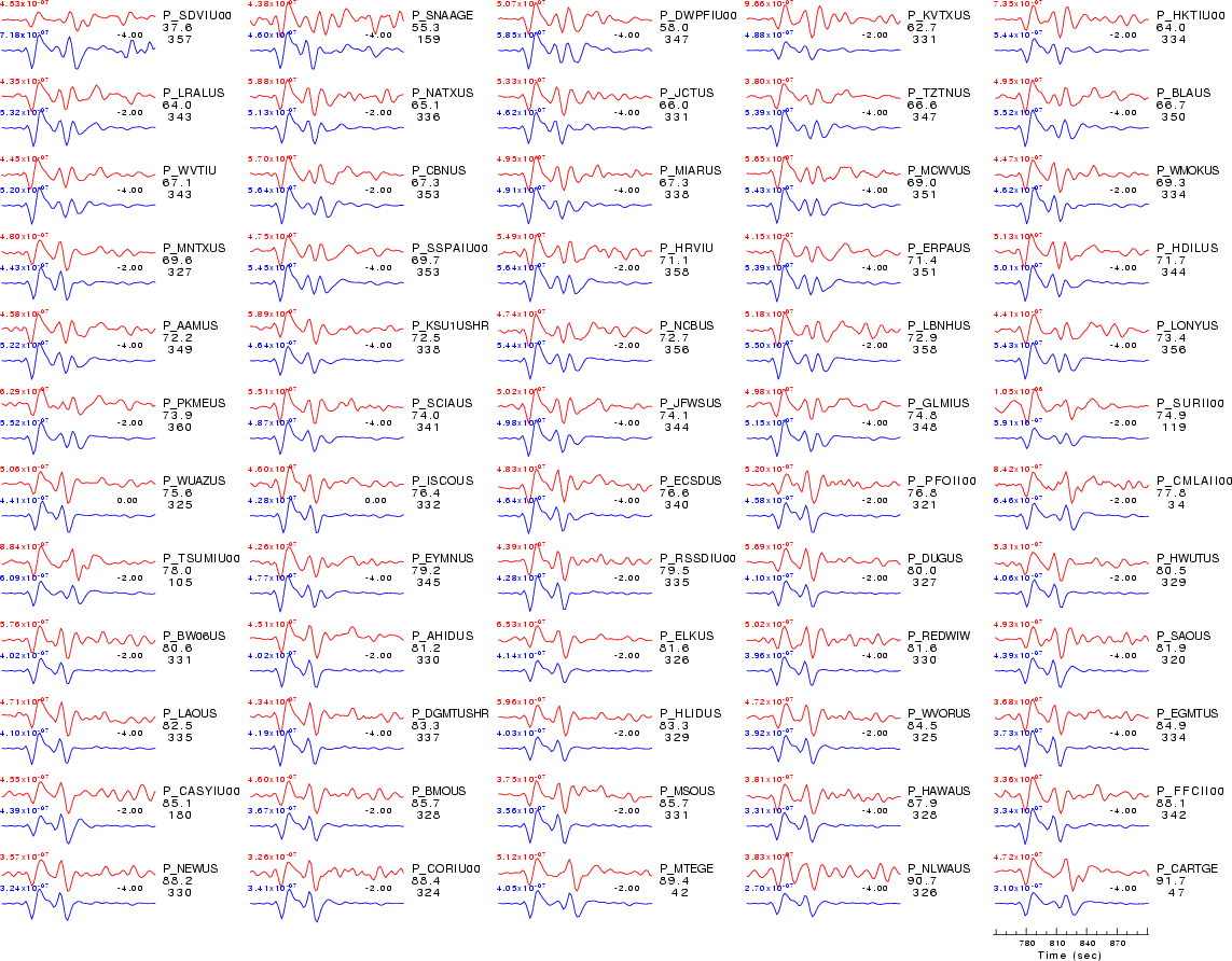 | Comparison of the observed traces (red) and solution predicted traces (blue) ordered in terms of increasing epicentral distance. Each pair of traces is annotated with the station name, epicentral distance in degrees, source to station azimuth in degrees. Each pair of traces is plotted with the same scale and the peak amplitudes are indicated at the lect of each trace. Finally the time shift between the P-wave first arrival picked and the the theoretical P-wave first arrival in the predicted trace is indicated, with a positive sign indicating that the predicted trace has been shifted to the right by the given number of seconds. as a function of source to station azimuth in degrees (D). The purpose of this display is to highlight the azimuthal dependence on the first motion. The traces are annotated with the station name at the top. |