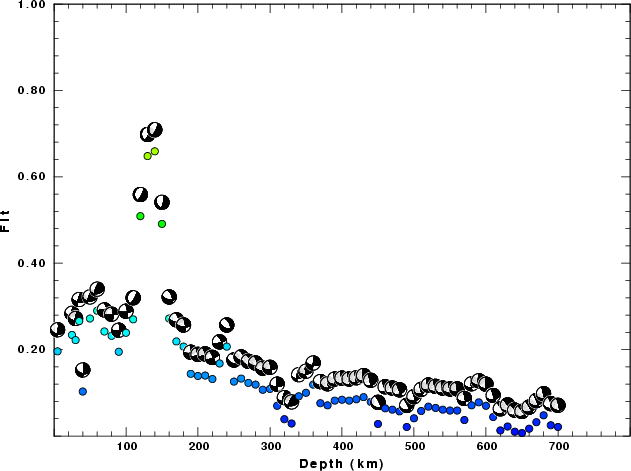 | Goodness of fit as a function of source depth. The measure is 1 - SUM (o -p)2 / SUM o2. A value of 1.0 is the best fit. The best double couple mechanism for the solution depth is plotted above goodness of fit value to indicate how the mefhanism may change with depth. |