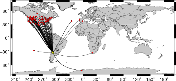 Location of the earthquake (yellow star) and great circle path from the epicenter to each station (red) [created using GMT (Wessel, P., and W. H. F. Smith, New version of Generic Mapping Tools released, EOS Trans. AGU, 76 329, 1995.)] |