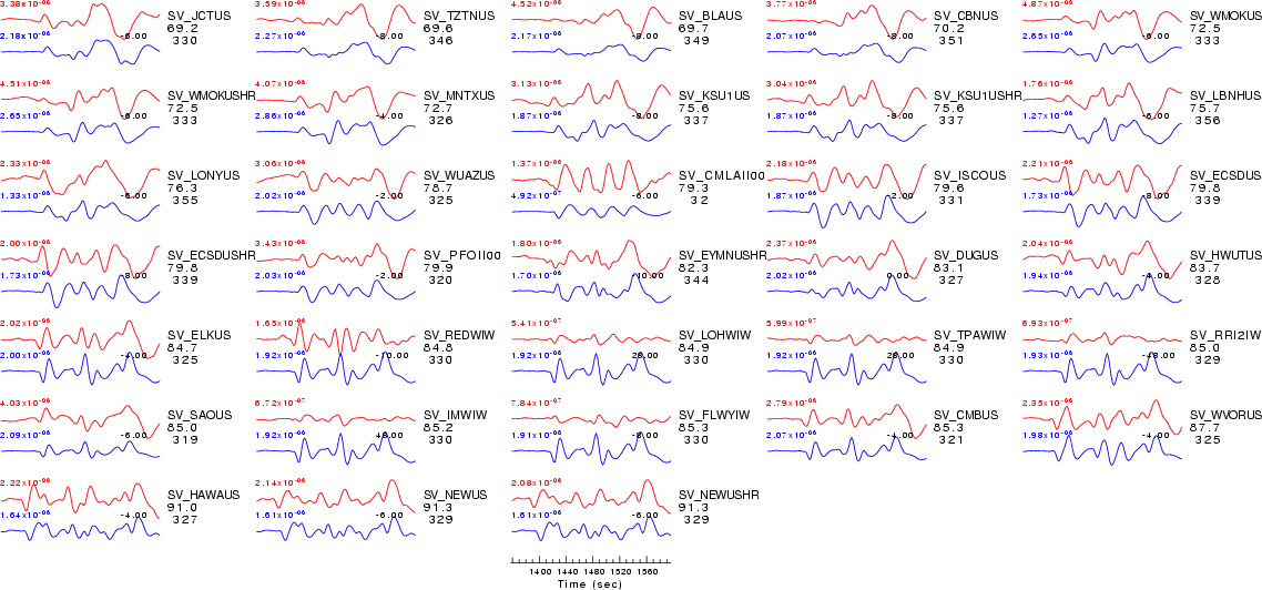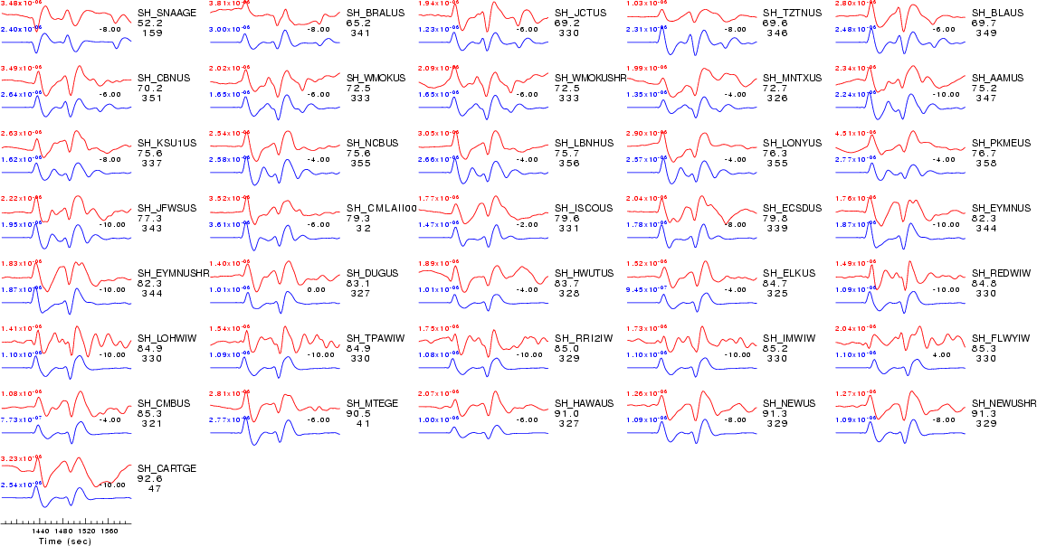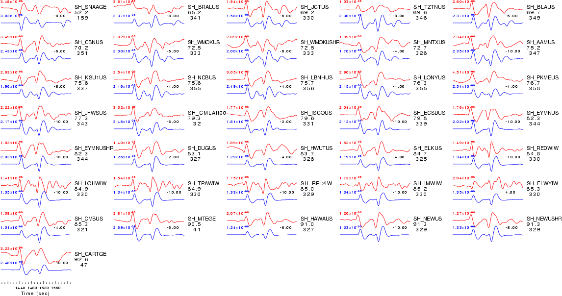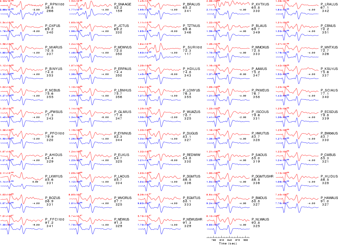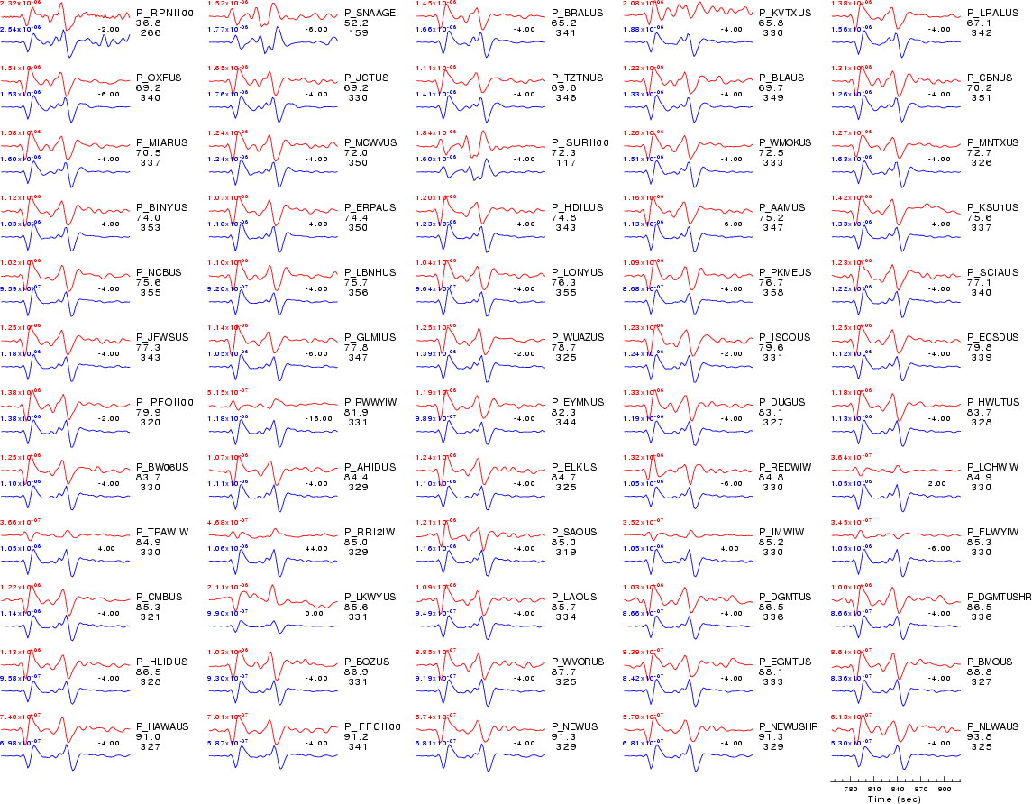 | Comparison of the observed traces (red) and solution predicted traces (blue) ordered in terms of increasing epicentral distance. Each pair of traces is annotated with the station name, epicentral distance in degrees, source to station azimuth in degrees. Each pair of traces is plotted with the same scale and the peak amplitudes are indicated at the lect of each trace. Finally the time shift between the P-wave first arrival picked and the the theoretical P-wave first arrival in the predicted trace is indicated, with a positive sign indicating that the predicted trace has been shifted to the right by the given number of seconds. as a function of source to station azimuth in degrees (D). The purpose of this display is to highlight the azimuthal dependence on the first motion. The traces are annotated with the station name at the top. |