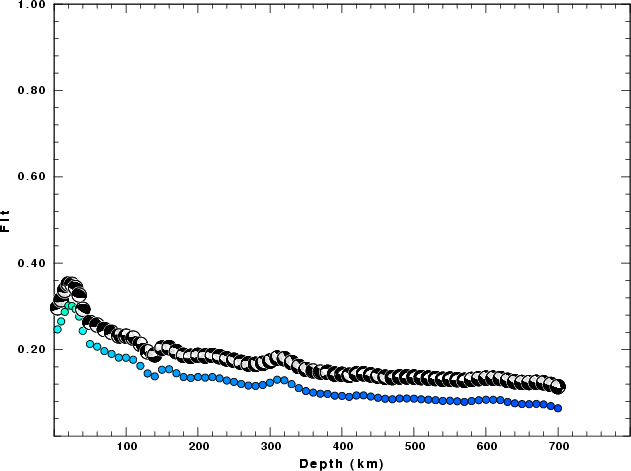 | Goodness of fit as a function of source depth. The measure is 1 - SUM (o -p)2 / SUM o2. A value of 1.0 is the best fit. The best double couple mechanism for the solution depth is plotted above goodness of fit value to indicate how the mefhanism may change with depth. |