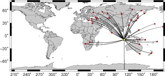Location of the earthquake (yellow star) and great circle path from the epicenter to each station (red) [created using GMT (Wessel, P., and W. H. F. Smith, New version of Generic Mapping Tools released, EOS Trans. AGU, 76 329, 1995.)] |