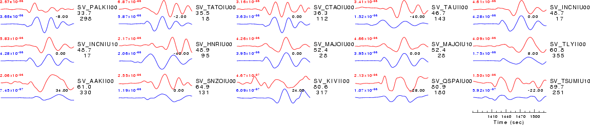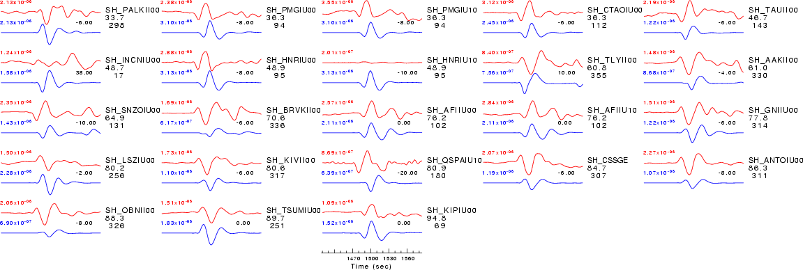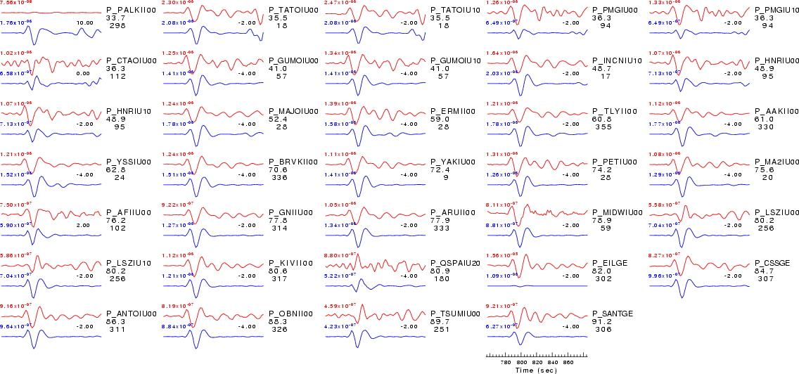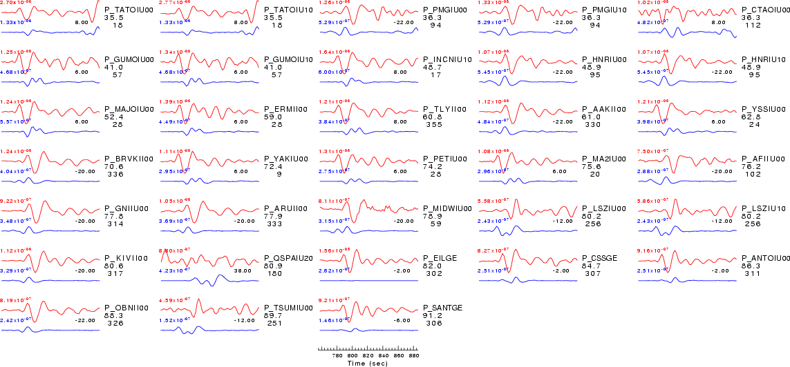 | Comparison of the observed traces (red) and solution predicted traces (blue) ordered in terms of increasing epicentral distance. Each pair of traces is annotated with the station name, epicentral distance in degrees, source to station azimuth in degrees. Each pair of traces is plotted with the same scale and the peak amplitudes are indicated at the lect of each trace. Finally the time shift between the P-wave first arrival picked and the the theoretical P-wave first arrival in the predicted trace is indicated, with a positive sign indicating that the predicted trace has been shifted to the right by the given number of seconds. as a function of source to station azimuth in degrees (D). The purpose of this display is to highlight the azimuthal dependence on the first motion. The traces are annotated with the station name at the top. |