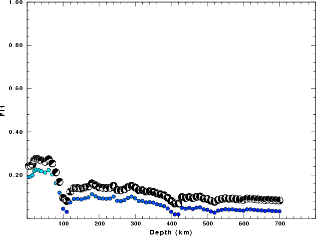 | Goodness of fit as a function of source depth. The measure is 1 - SUM (o -p)2 / SUM o2. A value of 1.0 is the best fit. The best double couple mechanism for the solution depth is plotted above goodness of fit value to indicate how the mefhanism may change with depth. |