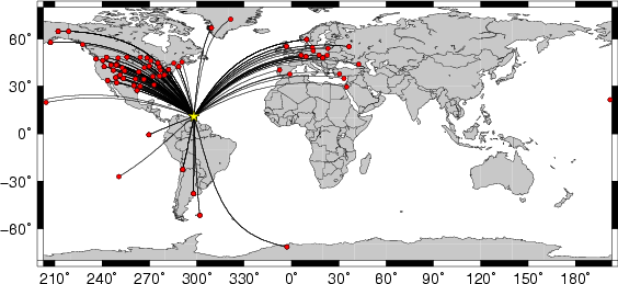 Location of the earthquake (yellow star) and great circle path from the epicenter to each station (red) [created using GMT (Wessel, P., and W. H. F. Smith, New version of Generic Mapping Tools released, EOS Trans. AGU, 76 329, 1995.)] |