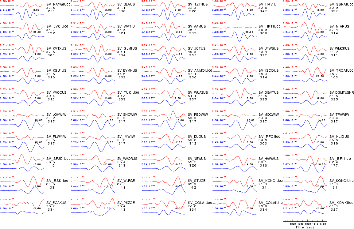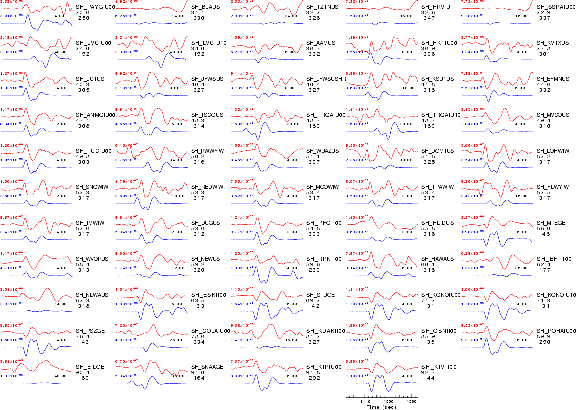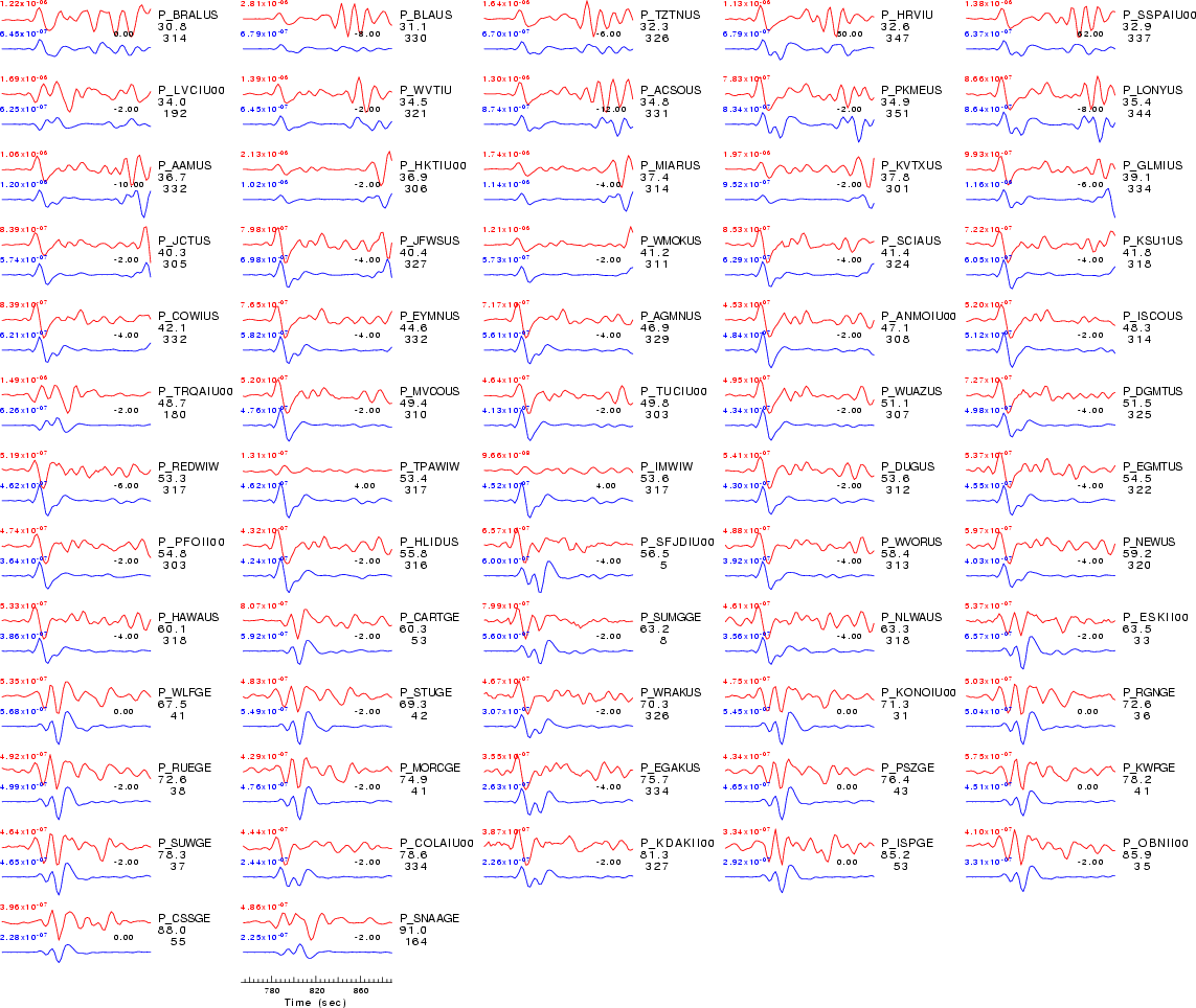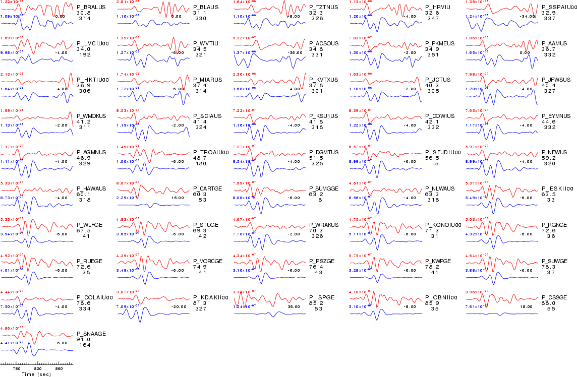 | Comparison of the observed traces (red) and solution predicted traces (blue) ordered in terms of increasing epicentral distance. Each pair of traces is annotated with the station name, epicentral distance in degrees, source to station azimuth in degrees. Each pair of traces is plotted with the same scale and the peak amplitudes are indicated at the lect of each trace. Finally the time shift between the P-wave first arrival picked and the the theoretical P-wave first arrival in the predicted trace is indicated, with a positive sign indicating that the predicted trace has been shifted to the right by the given number of seconds. as a function of source to station azimuth in degrees (D). The purpose of this display is to highlight the azimuthal dependence on the first motion. The traces are annotated with the station name at the top. |