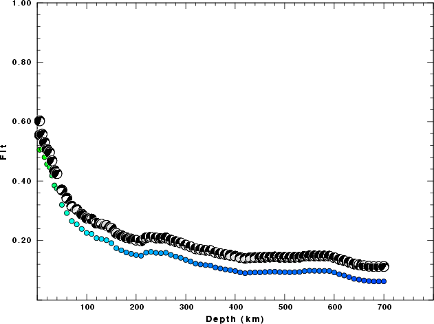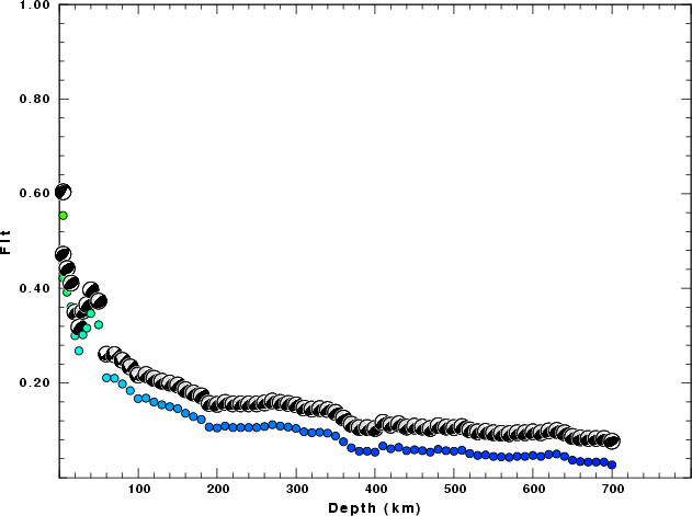 | Goodness of fit as a function of source depth. The measure is 1 - SUM (o -p)2 / SUM o2. A value of 1.0 is the best fit. The best double couple mechanism for the solution depth is plotted above goodness of fit value to indicate how the mefhanism may change with depth. |