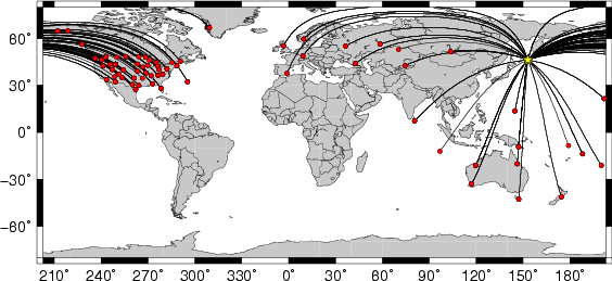 Location of the earthquake (yellow star) and great circle path from the epicenter to each station (red) [created using GMT (Wessel, P., and W. H. F. Smith, New version of Generic Mapping Tools released, EOS Trans. AGU, 76 329, 1995.)] |