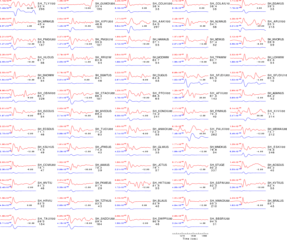 | Comparison of the observed traces (red) and solution predicted traces (blue) ordered in terms of increasing epicentral distance. Each pair of traces is annotated with the station name, epicentral distance in degrees, source to station azimuth in degrees. Each pair of traces is plotted with the same scale and the peak amplitudes are indicated at the lect of each trace. Finally the time shift between the P-wave first arrival picked and the the theoretical P-wave first arrival in the predicted trace is indicated, with a positive sign indicating that the predicted trace has been shifted to the right by the given number of seconds. as a function of source to station azimuth in degrees (D). The purpose of this display is to highlight the azimuthal dependence on the first motion. The traces are annotated with the station name at the top. |