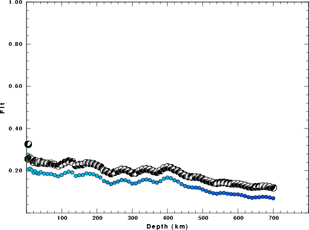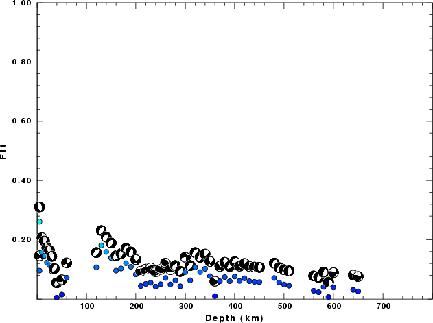 | Goodness of fit as a function of source depth. The measure is 1 - SUM (o -p)2 / SUM o2. A value of 1.0 is the best fit. The best double couple mechanism for the solution depth is plotted above goodness of fit value to indicate how the mefhanism may change with depth. |