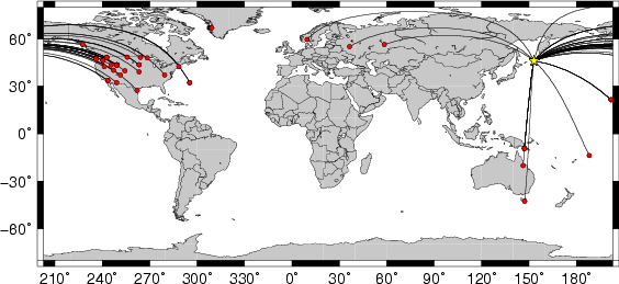 Location of the earthquake (yellow star) and great circle path from the epicenter to each station (red) [created using GMT (Wessel, P., and W. H. F. Smith, New version of Generic Mapping Tools released, EOS Trans. AGU, 76 329, 1995.)] |